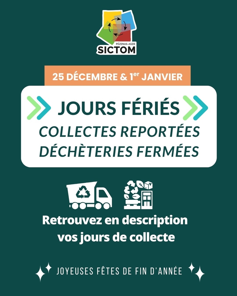INFO SICTOM - Collectes et déchèteries - Jours fériés du 25 décembre et du 1er janvier