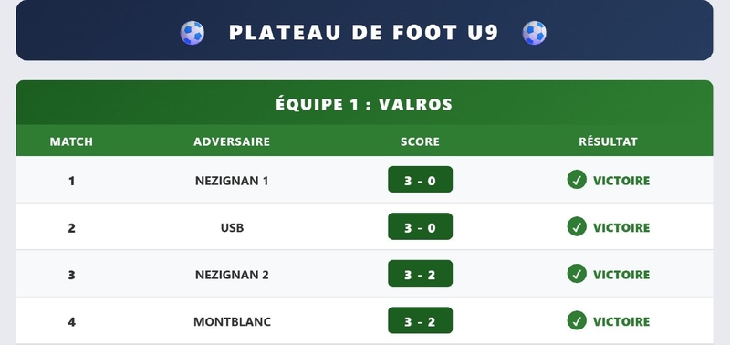 Lors du dernier plateau à Valros, les U9 ont remportés leurs 4 matchs ! Les éducateurs retiennent surtout l’envie, les passes, les efforts collectifs et de très belles constructions. Ils félicitent grandement les enfants qui depuis peu partagent leur entraînement avec les U9 de Montblanc.