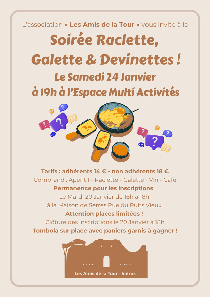 L’association « Les Amis de la Tour » vous invite à la Soirée Raclette, Galette & Devinettes !